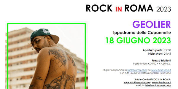 A Rock in Roma 2023 arriva il rap targato Napoli di GEOLIER, in concerto il 18 giugno 2023 all’Ippodromo delle Capannelle. I biglietti sono disponibili su rockinroma.com, su www.ticketone.it e nei punti vendita autorizzati Ticketone. Il 2023 è sicuramente l’anno di GEOLIER. Dopo aver collezionato un successo dopo l’altro con i suoi album “IL CORAGGIO DEI BAMBINI” e “IL CORAGGIO DEI BAMBINI – ATTO II” e aver mandato sold out il suo tour indoor, Geolier sarà tra i protagonisti indiscussi anche dell’estate live italiana con una tournée di venti date, in cui il rapper infiammerà i palchi dei migliori festival di tutta la penisola.