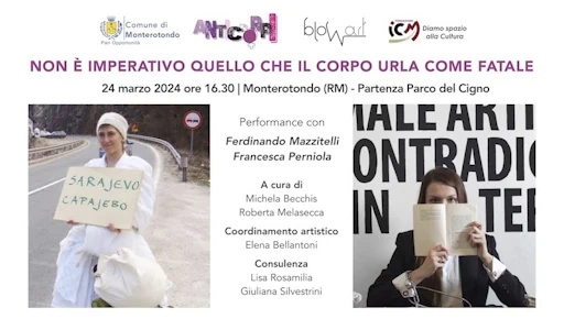 In questo contesto, il 24 marzo 2024, prende vita la performance “Non è imperativo quello che il corpo urla come fatale”, un evento promosso dall’Associazione Culturale blowart, ideato da Roberta Melasecca, curato insieme a Michela Becchis e con il coordinamento artistico di Elena Bellantoni. La performance vede protagonisti gli artisti Ferdinando Mazzitelli e Francesca Perniola, i quali, attraverso un itinerario performativo che si snoda nel cuore storico di Monterotondo, daranno corpo e voce alle figure di Chiara Fumai e Pippa Bacca, due artiste prematuramente scomparse che hanno saputo utilizzare l’arte come strumento di denuncia e di riflessione sulla condizione femminile.