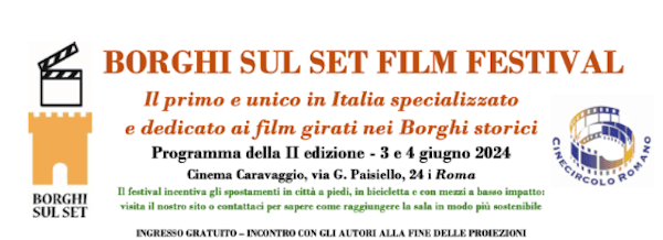 Il 3 e 4 giugno 2024 si terrà presso il Cinema Caravaggio di Roma la seconda edizione del festival cinematografico “Borghi sul set”, organizzato dall’associazione Cinecircolo Romano. Ideato dalla presidente Daniela Cipollaro e dal direttore artistico Catello Masullo, questo festival rappresenta il primo in Italia interamente dedicato a film girati negli antichi borghi storici del nostro Paese, noti per il loro fascino e la loro magia, che li rende location ideali per set cinematografici noleggiati per produzioni dal profilo suggestivo.