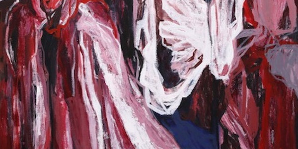Il viaggio attraverso le trame di luce inizia con le tele raffiguranti Il peso della lana e Sete uzbeke, olio e fili di seta, rispettivamente del 2008 e del 2010: matasse colorate stese su pioli di legno a catturare lo sguardo come una tavolozza di colori sgargianti, che va dai rossi amaranto, ai viola, ai verdi, agli azzurri, ai gialli oro. […] Nella Cascata di lana, del 2020, la forza selvaggia dei filati rosso sangue trasfigura il soggetto originario in una tumultuosa materia vitale, mentre Asciugatura sui tetti (2020) supera il confine della rappresentazione per evocare, attraverso il motivo dello sgocciolamento di un rosso che sembra sangue, una macellazione di agnelli. Nel grande Incontro ravvicinato, viola e arancio, del 2021, l’autrice fa emergere una materia pulsante e corposa, ritmica e inquieta, che va molto oltre lo spunto iniziale: è possibile cambiare registro, migrare dal figurativo all’informale e viceversa, se l’occhio si fa catturare dai ritmi dissonanti, dalle dinamiche interne di cadute e scuotimenti che ricordano certe astrazioni di Schifano, o se riordina la visione nello schema di partenza. […] Le matasse si trasformano, nell’ultima serie di opere, in grandi masse cromatiche tendenti al non figurativo, sprazzi di luce colorata, come Contrasti di colori e Incontri di colori (2022). Progressivamente le forme si sfaldano e il colore diventa protagonista in accordi imprevisti, in sfilacciamenti che sono tutt’uno con le pennellate e i tocchi di luce, come nella giustapposizione fra rosa, rossi e celesti di Sete fluttuanti del 2021, o nell’energetico contrasto di rossi e viola di Svelando il buio (2021), sublimazione cromatica che ricorda alcune opere Fauve, o il Kandinskij delle prime opere astratte, fino all’informale.” (estratto dal testo critico di Costanza Barbieri)