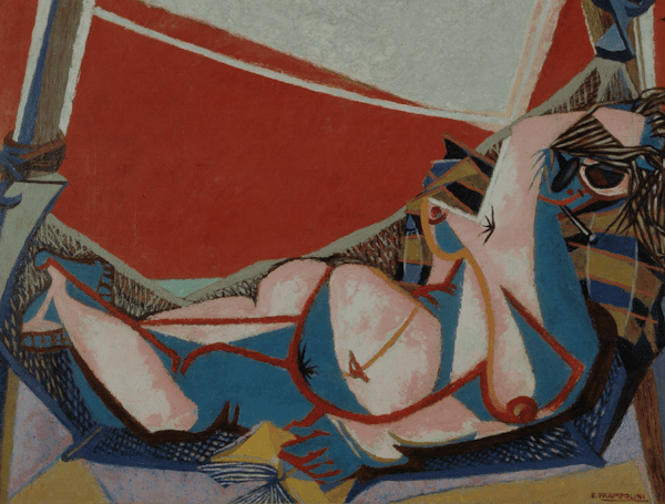 Un potente corpus grafico posto in mostra anche attraverso la creazione di percorsi grafici e parallelismi iconografici con le opere pittoriche dello stesso Prampolini, provenienti dalla Galleria d’Arte Moderna e da altre importanti collezioni d’arte pubbliche (Galleria Nazionale d’Arte moderna e contemporanea, MART di Rovereto, Museo del Novecento di Firenze e Collezione Roberto Casamonti di Firenze), e private, oltre alle opere messe gentilmente a disposizione dagli eredi stessi di Prampolini.