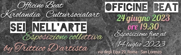 Si conclude con SEI NELL’ARTE Esposizione collettiva il percorso del format d’arte TRITTICO D’ARTISTA Selezione personale di opere in mostra organizzato da OFFICINE BEAT, KIROLANDIA e CULTURSOCIALART. Sabato 24 giugno alle ore 19.30, presso il cocktail bar bistrot OFFICINE BEAT di Roma, si svolgerà l’ultima tappa dell’affabulante percorso artistico che vedrà riuniti i sei artisti che hanno partecipato al format. PAOLO “MAKKA” MACCARI, DANIELE MAZZOLI, JEREMY BASTIANIELLO, ROBERTO RINALDI, FLAVIA MITOLO e GIOVANNI PALMIERI esporranno in un’unica mostra a cura di Andrea Alessio Cavarretta, presentazione di Stefania Visconti, testo del percorso narrativo di Elena Costa, organizzazione di Giovanni Palmieri e Sissi Corrado.