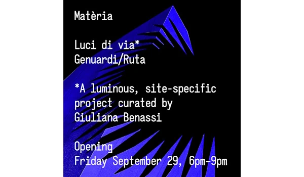 Il 29 settembre, Matèria è lieta di presentare Luci di via, un progetto che vede la partecipazione del duo artistico Genuardi/Ruta a cura di Giuliana Benassi. Con Luci di via, Matèria estende il proprio spazio espositivo lungo il perimetro esterno della galleria, presentando le opere luminose.