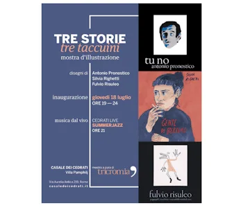 La mostra “TRE STORIE / tre taccuini” sarà inaugurata giovedì 18 luglio alle ore 19:00 presso il Casale dei Cedrati, nel Parco di Villa Pamphilj a Roma. L’evento proseguirà fino alle 24:00, con proiezioni di cortometraggi e un concerto jazz dal vivo. La mostra è curata dalla Galleria Tricromia, che da trent’anni promuove illustratori e fumettisti con passione e dedizione. La storica galleria, situata in Via Roma Libera 10, è visitabile solo su appuntamento il venerdì e il sabato dalle 11:00 alle 18:00. Per ulteriori informazioni, è possibile contattare il numero 39 3397856006.