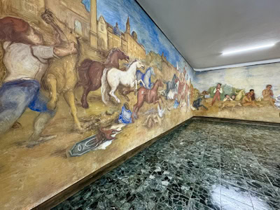 Il murale “Carnevale Romano” di Orfeo Tamburi rappresenta un pezzo importante della storia artistica e culturale di Roma. Creato in un periodo in cui il Carnevale era una delle celebrazioni più significative della città, l’affresco cattura l’essenza di questa tradizione ormai perduta. Situato all’interno di una sala originariamente concepita come “sala di rappresentanza”, il murale è stato realizzato su un supporto murario di foratini, sollevato da terra e incorniciato da una fascia di ottone. La sua struttura curvilinea abbraccia tre pareti, creando un effetto avvolgente che immerge lo spettatore nell’atmosfera festosa del Carnevale.