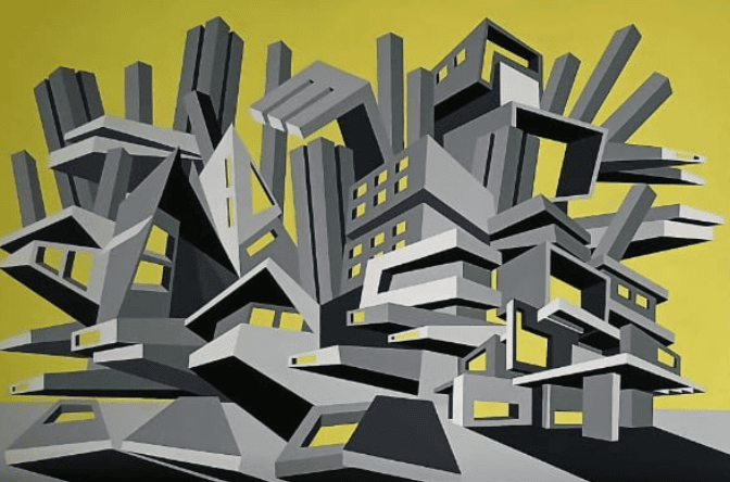 “Il colore è ciò che dà voce a queste emozioni”, afferma l’artista, sottolineando come le sue città immaginarie siano in realtà specchi della vita vissuta. Le tinte forti non sono decorative, ma funzionali a raccontare la vitalità frenetica e gioiosa che scorre dentro gli edifici. In Monocromi contigui, il colore agisce come un evidenziatore psichico: seleziona porzioni di spazio e le carica di significato, costringendo lo spettatore a non limitarsi a osservare l’edificio, ma a “sentire” la sua vibrazione interna.