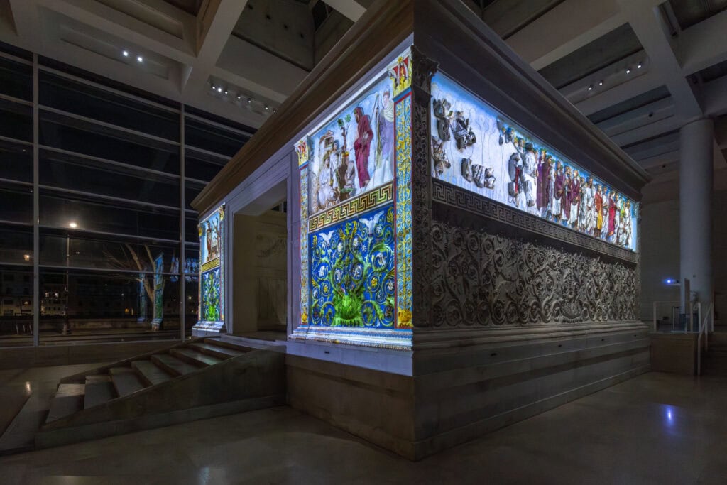 La magia visiva di questo nuovo allestimento poggia su una base tecnologica di altissimo profilo. L’intero show è gestito da un sistema di otto videoproiettori 4K laser, coordinati da un mediaserver in grado di modulare profili e colori in tempo reale, sincronizzandoli con l’illuminazione interna del museo. Questa precisione millimetrica permette di “dipingere” letteralmente sui rilievi di marmo, rivelando dettagli che l’occhio nudo faticherebbe a scorgere. La scelta delle colorazioni non è frutto di fantasia artistica, ma il risultato di anni di analisi di laboratorio e confronti filologici con la pittura romana coeva, in particolare quella pompeiana, per restituire una policromia che fosse il più possibile fedele all’originale antico.