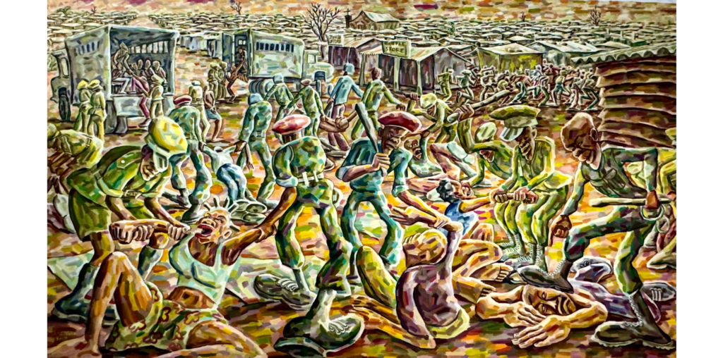 Sulla stessa linea di denuncia delle eredità traumatiche, il sudafricano di formazione Lovemore Kambutzi esplora l’apartheid non come un capitolo storico definitivamente chiuso, ma come un trauma ancora attivo che struttura e condiziona l’organizzazione spaziale e sociale del presente. Il suo grande dipinto dal titolo Apartheid ritrae soldati intenti a picchiare civili in un villaggio periferico, utilizzando colori giallo-verdi quasi allucinatori e una densità espressionista che impediscono allo spettatore di mantenere una confortevole distanza di sicurezza emotiva. Anche la fotografia in bianco e nero di Mario Macilau colpisce il pubblico per la sua cruda immediatezza: il ritratto di un bambino mozambicano con un Kalashnikov puntato alla testa testimonia la realtà bellica senza ricorrere a filtri estetizzanti o a una facile retorica della compassione, ricordandoci che la ferita sociale è tangibile e costantemente aperta.