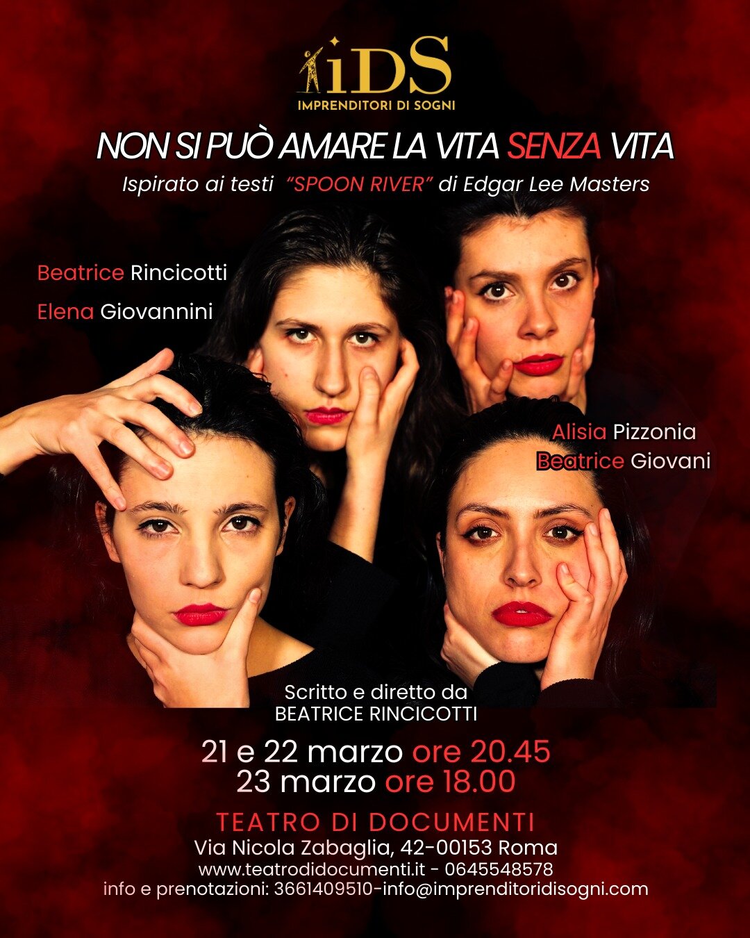 L’idea centrale dello spettacolo è rappresentare le quattro figure femminili simboliche, ognuna delle quali incarna un aspetto particolare della femminilità: la libertà, la purezza, la maternità e l’emarginazione. “Non si può amare la vita senza vita” prende ispirazione dai testi di Edgar Lee Masters, in particolare la celebre “Antologia di Spoon River”, utilizzando un linguaggio teatrale che spazia dalla prosa ai movimenti coreografici. Questo spettacolo invita il pubblico a riflettere su temi sempre attuali e profondi, che non smettono mai di interrogare la società contemporanea.