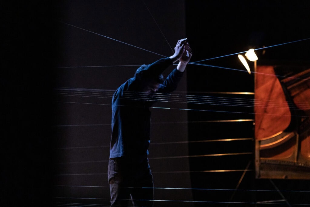 Al centro del dispositivo scenico e sonoro ideato da Alvise Sinivia, si trovano i cosiddetti “pianoforti disossati”. Con questo termine si indicano pianoforti ormai in disuso, privati di tutto tranne che delle tavole armoniche, trasportate da strumento a puro corpo sonante. La scena si arricchisce del dispositivo Ersilia, che connette i frammenti di questi strumenti con fili di nylon per produrre suoni unici e risonanze evocative, in un vero e proprio dialogo tra movimento e musica.