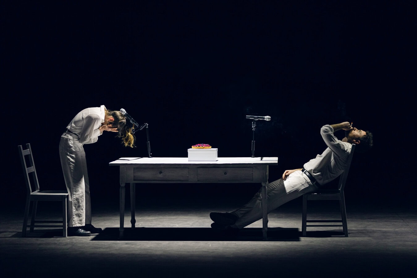 I due protagonisti giocano, si scontrano e si riappacificano, ma lo spettatore viene presto avvolto da un dubbio fondamentale: chi sta parlando a chi? La regia di Businaro lavora sulla liquefazione del tempo, rendendo difficile distinguere il piano della realtà da quello del ricordo o della pura immaginazione. Quello che accade sul palco potrebbe essere un tentativo di ricordare, o forse, paradossalmente, un tentativo di dimenticare. È il racconto di un naufragio emotivo, dove i frammenti di un passato condiviso – i riti familiari, il linguaggio in codice dell’amore – galleggiano in una stanza che rischia di essere sommersa. La cucina bianca diventa così il teatro di una lotta interiore per elaborare una perdita improvvisa e lacerante, come quella causata dal suicidio della persona con cui si era progettato il futuro.