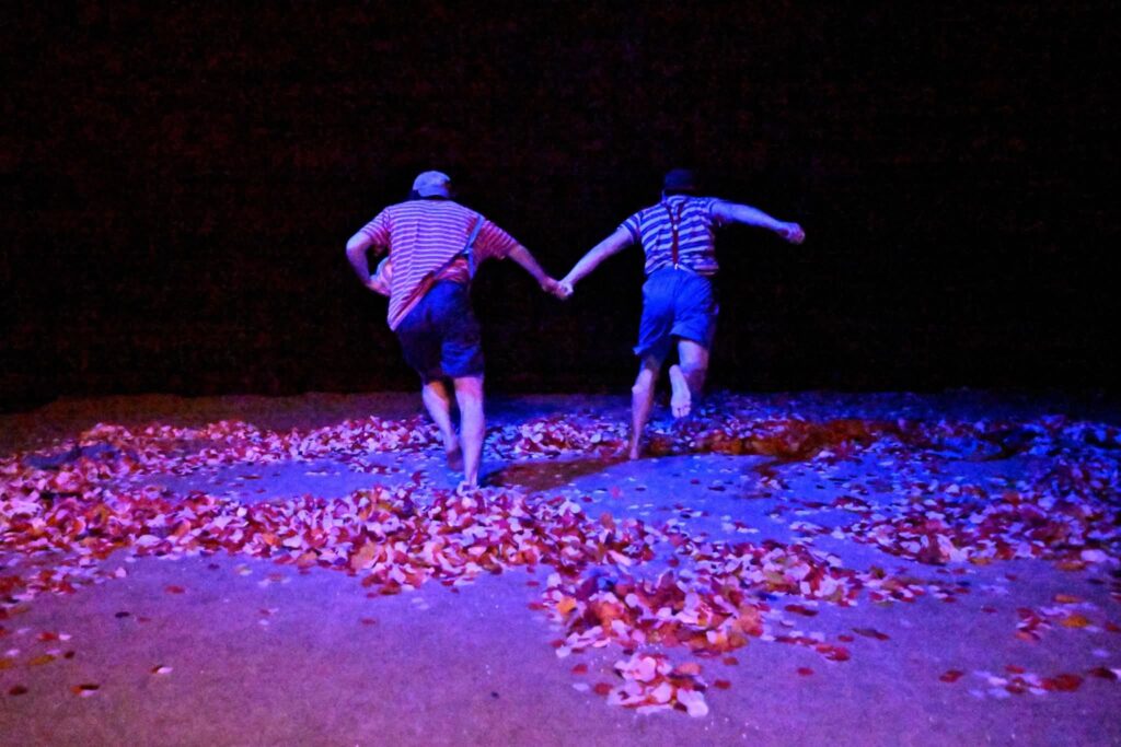 Dal punto di vista visivo, lo spettacolo è caratterizzato da scelte estetiche molto precise e cariche di significati simbolici. La scena è dominata da un tappeto di fiori, un elemento ricorrente nella poetica del regista che qui assume il valore di una metafora della bellezza effimera. Come i fiori, l’amore è destinato a sfiorire, ma proprio in questa sua caducità risiede il suo splendore più autentico. Questo elemento naturale contrasta e al tempo stesso completa la fisicità degli attori, creando un quadro visivo di forte impatto che accompagna la narrazione lungo tutto il suo svolgimento.