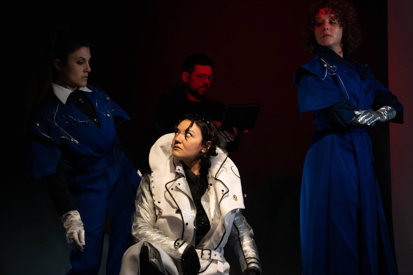 I costumi, che richiamano l’idea di uniformi di un futuro prossimo, completano questa visione, trasformando gli attori in dispositivi viventi, ibridi tra l’umano e la macchina. Questa scelta estetica non è solo un omaggio al genere space opera, ma serve a sottolineare la tesi centrale dello spettacolo: la trasformazione del corpo umano in mera interfaccia. In questo palcoscenico, la recitazione diventa meccanica, robotica, eppure carica di una disperata umanità. È proprio questa tensione tra la precisione algoritmica e il bisogno insopprimibile di connessione emotiva a rendere lo spettacolo un’esperienza teatrale di grande impatto visivo e concettuale.