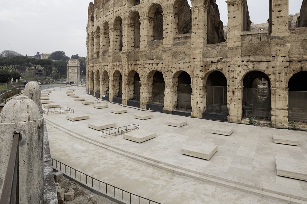 La novità più significativa dell’intervento riguarda il ripristino della quota originale di calpestio. La pavimentazione in travertino, posata seguendo i livelli dell’età Flavia, permette finalmente di distinguere con nettezza il profilo del Colosseo dalla piazza moderna in sampietrini. Questo “salto temporale” non è solo estetico: serve a restituire la corretta proporzione monumentale all’Anfiteatro Flavio, permettendo all’occhio di percepire la maestosità della crepidine originale. Lo scavo archeologico ha inoltre riportato alla luce i resti della pavimentazione antica, finora sepolti, offrendo nuovi dati preziosi agli studiosi.