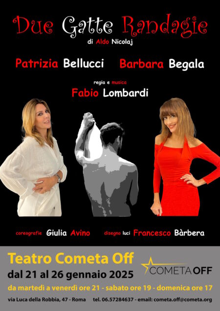 Dal 21 al 26 gennaio, il Teatro Cometa Off di Roma ospita “Due Gatte Randagie”, una commedia di Aldo Nicolaj che esplora l’universo femminile attraverso le vicende di due amiche-nemiche. Con un mix di ironia e introspezione, lo spettacolo affronta temi come l’abbandono e la rivalità, promettendo un finale sorprendente