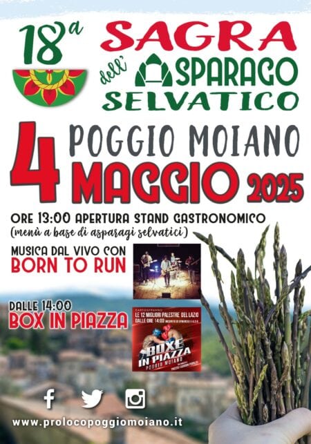 Estratto: Il 4 maggio, Poggio Moiano ospita la Sagra dell’Asparago Selvatico, un evento che celebra gusto e tradizione nella splendida cornice sabinese. Con un menù imperdibile che esalta i sapori degli asparagi selvatici, l’evento promette una giornata all’insegna di natura e deliziose esperienze culinarie.