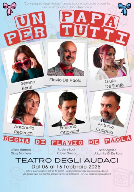La commedia degli equivoci “Un papà per tutti” torna al Teatro degli Audaci di Roma dal 6 al 16 febbraio 2025. Con un cast di talento e la regia di Flavio De Paola, lo spettacolo promette risate e riflessioni su temi sociali come l’adozione e l’omosessualità. Non perdete questo appuntamento!