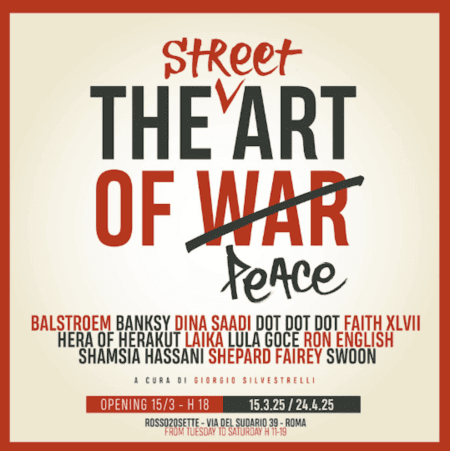 La mostra “The(Street) Art of Peace”, presso Rosso20sette arte contemporanea a Roma, riunisce artisti mondiali di street art come Ron English e Shamsia Hassani per promuovere la pace attraverso l’arte. Dal 15 marzo al 24 aprile, offre un dialogo tra immagine e riflessione, invitando a un impegno collettivo per un mondo migliore.